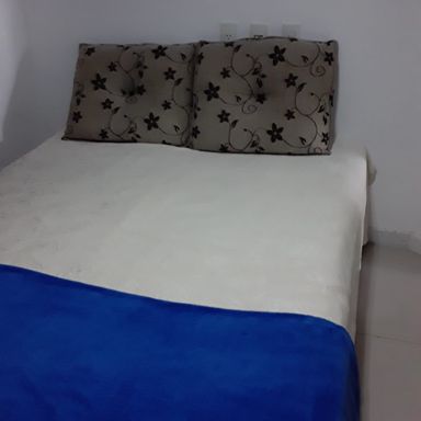 Na sala, há uma estante tipo arca, cama de casal, mesa de vidro com 4 cadeiras.