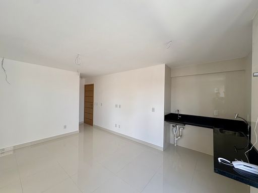 Sala ampla para dois ambientes, cozinha integrada e banheiro social. Dois quartos, sendo uma suíte, proporcionam um ambiente acolhedor. O imóvel inclui uma vaga de garagem coberta.