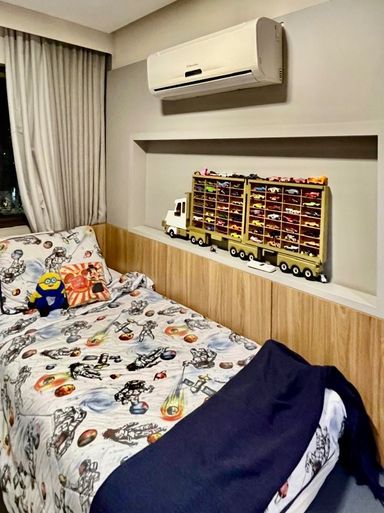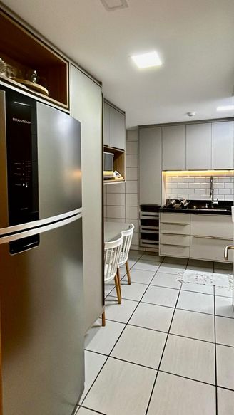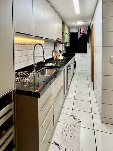 O imóvel possui 3 quartos (sendo 1 suíte), 2 banheiros, ampla sala para dois ambientes, cozinha funcional, área de serviço, e 2 vagas de garagem. Unidade voltada para o nascente, andar intermediário, garantindo ótima ventilação e iluminação natural.