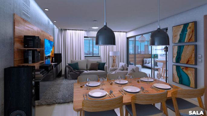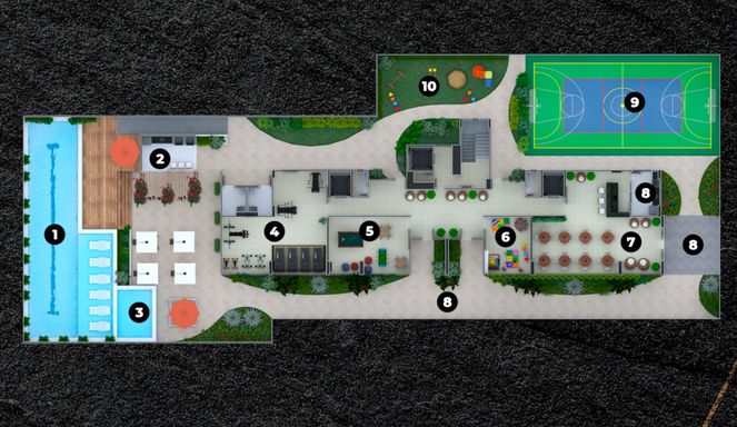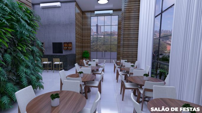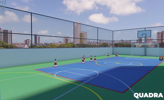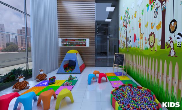 Amplas áreas comuns e espaços de lazer: Piscina, Espaço Gourmet, Piscina Infantil, Academia, Salão de Jogos, Espaço Kids, Salão de Festas, Pátio Externo, Quadra Poliesportiva e Playground.
