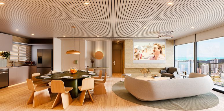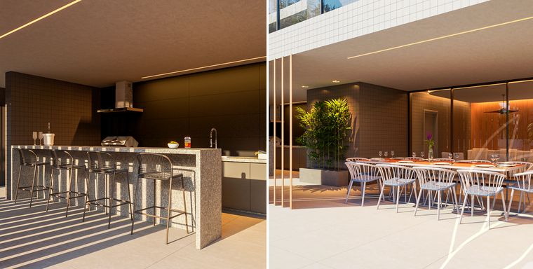 A área social é composta por uma sala ampla integrada em dois ambientes (estar e jantar) conectada diretamente à varanda gourmet, criando um espaço ideal para convivência e recepção de convidados. Ao lado da sala está a cozinha espaçosa, com acesso à área de serviço, banheiro de apoio e dependência, formando um núcleo de serviço bem separado da área íntima.