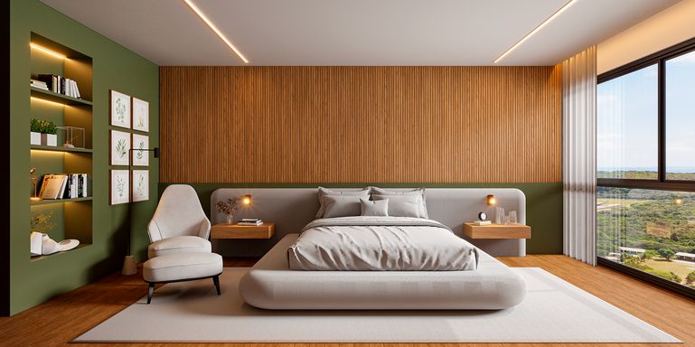 O piso superior concentra a área íntima, com 3 suítes bem distribuídas, incluindo uma suíte master com closet e banheiro amplo, oferecendo maior conforto e privacidade.