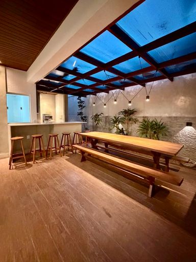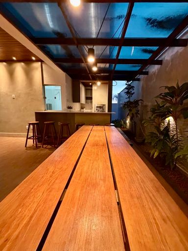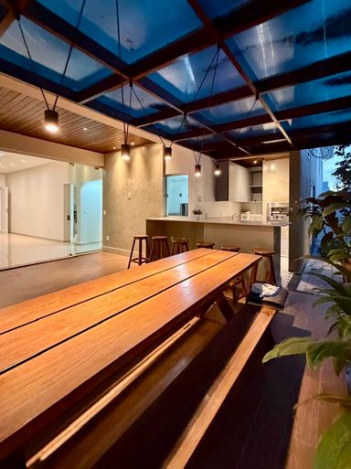 A área social impressiona pelo pé direito elevado e integração dos ambientes, com sala de estar ampla e jardim interno que valoriza iluminação natural. A sala de jantar conecta-se à área externa, criando um fluxo perfeito para convivência.
